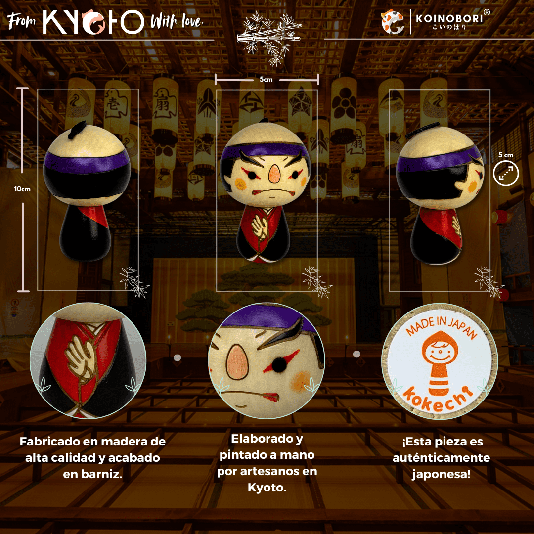 Esta Kokeshi representa a un actor de teatro kabuki con su representativo traje y expresión facial en una pose llamada “Mie”, es decir, la postura y la mirada fijas que adopta el actor cuando las emociones alcanzan su clímax. Ya sea para tu propio disfrute o para regalar a alguien especial, es el complemento perfecto para decorar tus espacios al mejor estilo tradicional japonés. ¡Anímate a recibir la energía de la primavera con esta preciosa Kokeshi artesanal original de Kyoto!